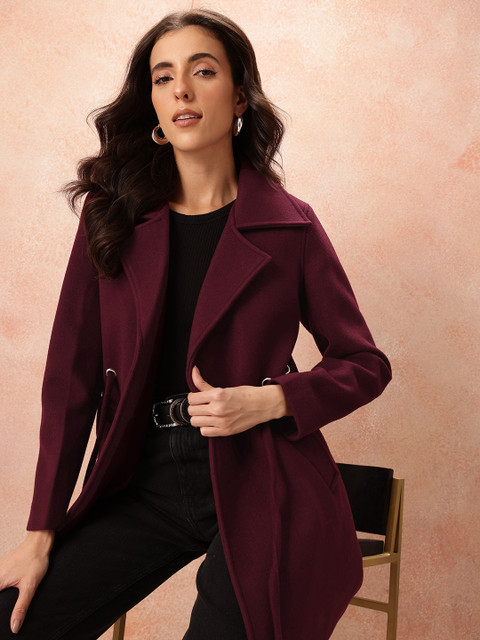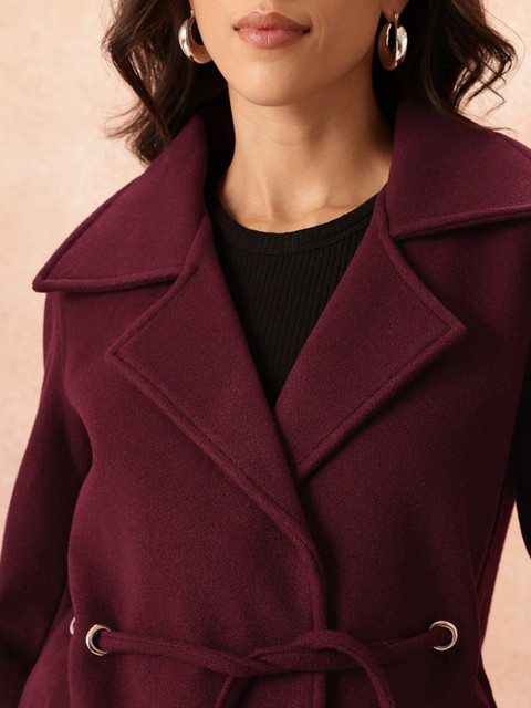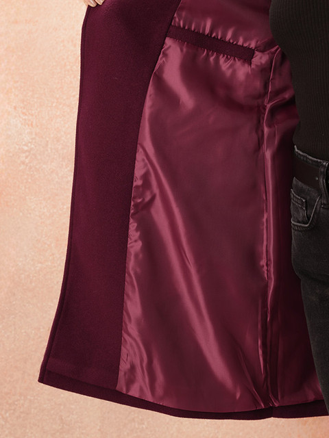Burgundy solid overcoat, notched lapel collar, tie-up, 2 pockets, polyester lining, 1 pocket in inner lining, hip length