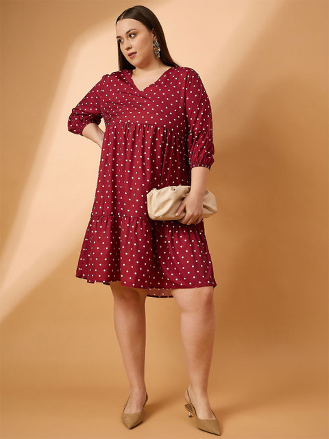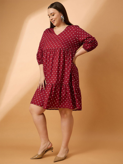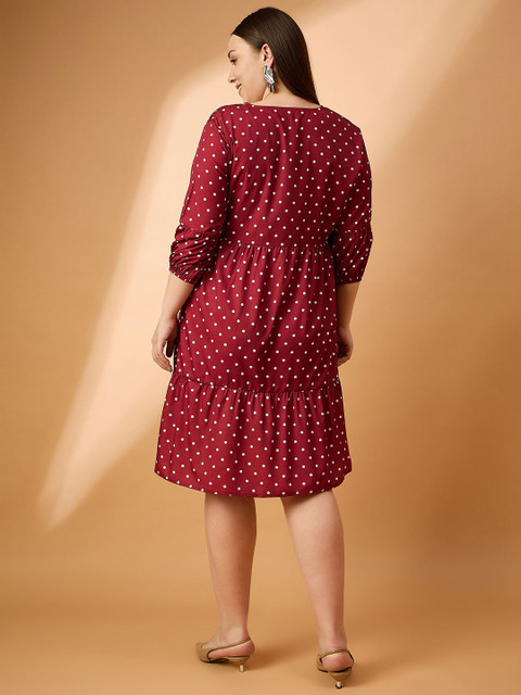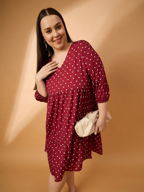| Style Tip | elevate this maroon polka dot dress with a pair of beige or nude heels to elongate your legs, and accessorize with statement earrings for a touch of glam. add a structured handbag for a polished look, and during cooler months, layer with a cropped denim jacket or a neutral cardigan. keep your makeup fresh with a pop of red or berry lipstick to complement the dress's color! |
