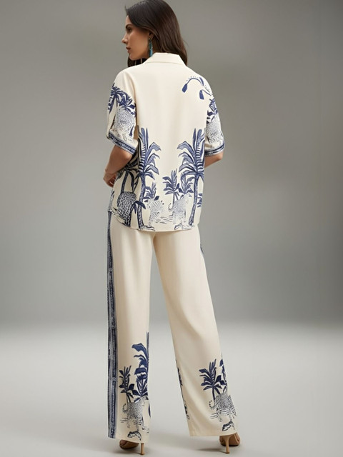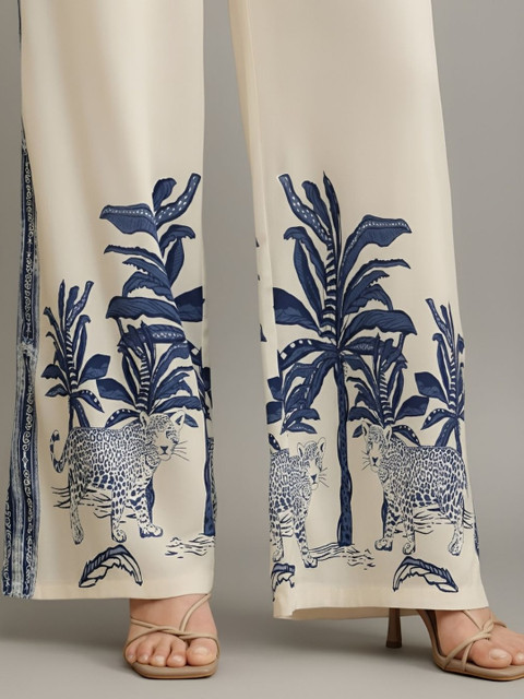 Blue and Cream printed trousers, has an elasticated waistband with slip-on closure has 2 pockets