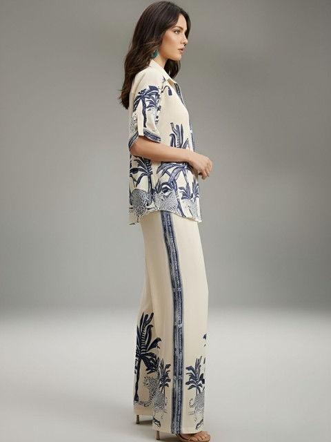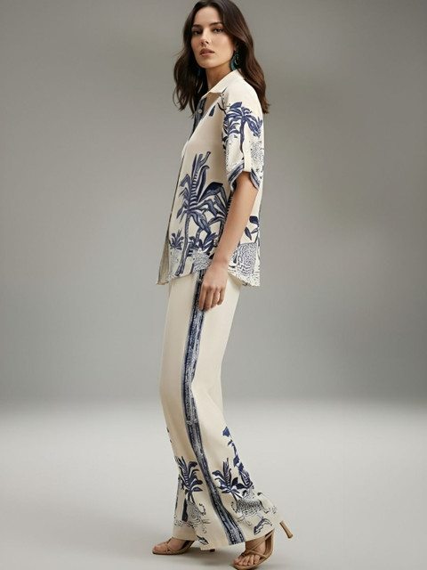 Blue and cream printed shirt, has a shirt collar neck and shorts sleeves, secured with button closure