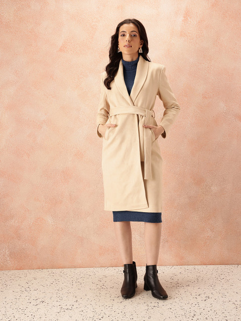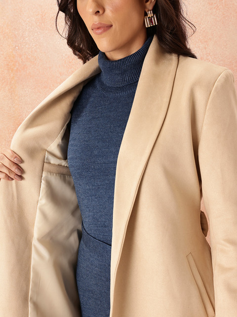 Beige solid single-breasted overcoat has a shawl collar, long regular sleeves, 2 pockets  straight hem