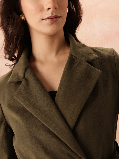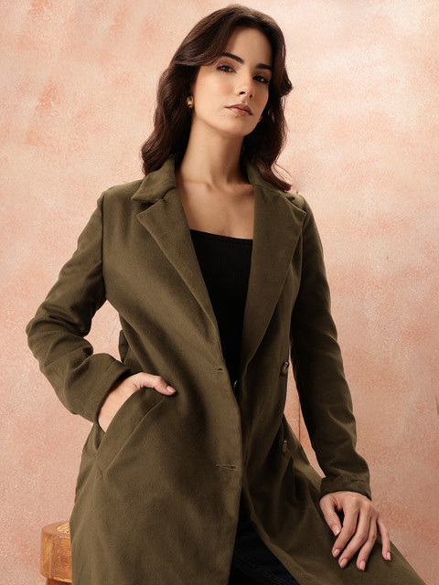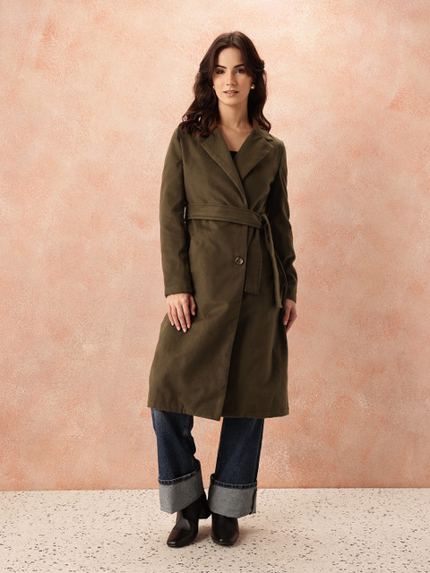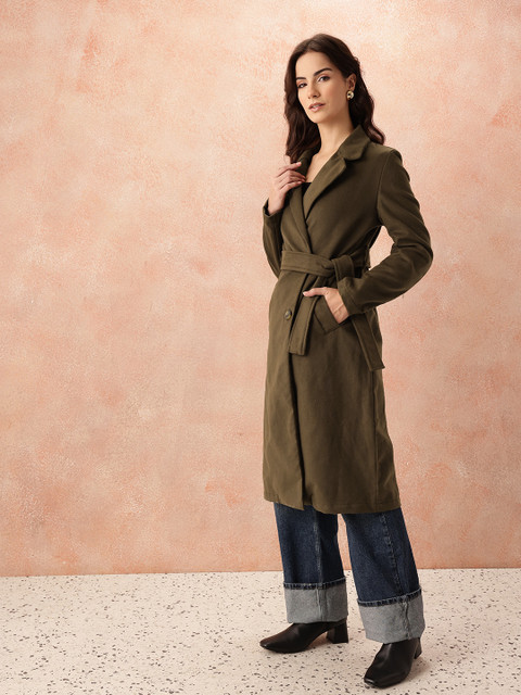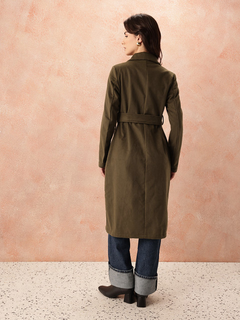 Olive coloured knee length overcoat, has a notched lapel collar, 3 pockets, single-breasted, long sleeves, straight hemline, polyester lining, comes with a belt
