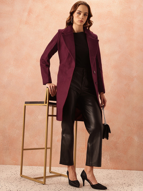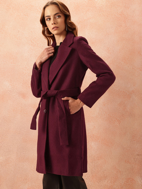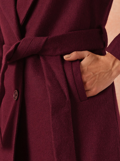 Burgundy solid overcoat, has a notched lapel collar, long sleeves, tie-up belt, 3 pockets, knee length, and an attached lining