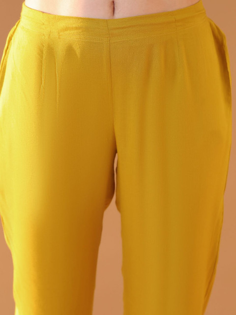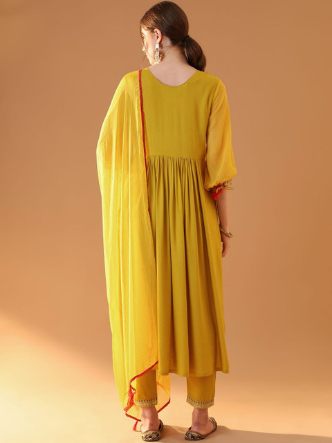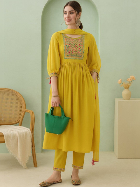 Ideal to wear all through the year. Included a designed kurta, a Bottomwear, and an eye-catching embellished dupatta with border, this set is sure to become your favourite.