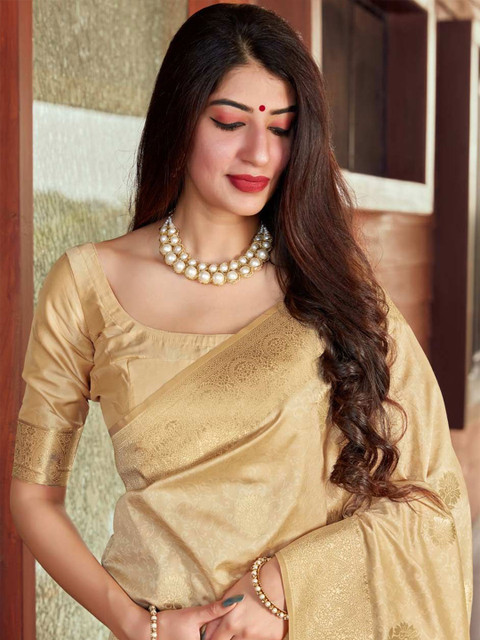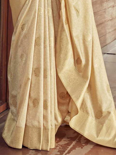 - Cream-coloured and gold-toned kanjeevaram saree
