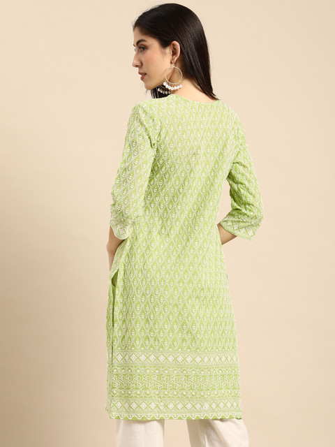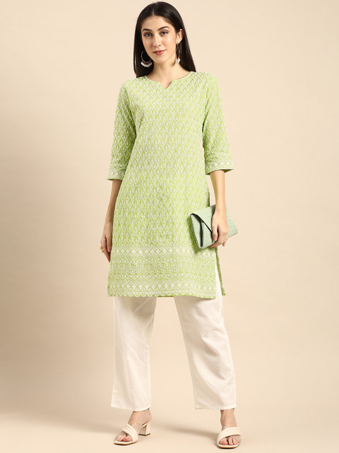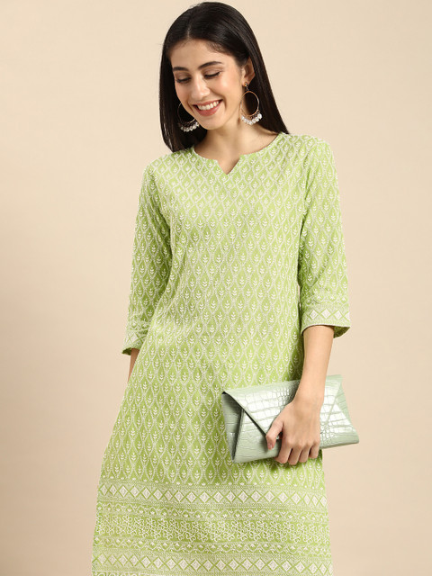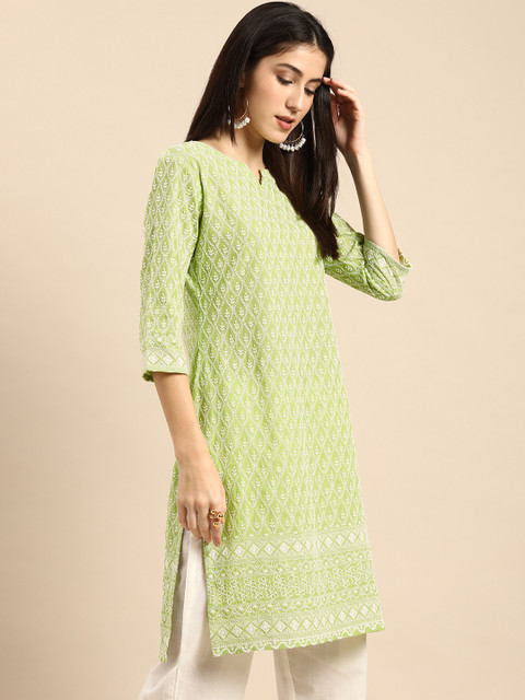 It a fully embroided knee length kurta with slightly transparent fabric due embroidery. The color palette used in the kurta is great for dusky skin tones with warm undertones and the neck design is a blessing for people with round face. The size measurements are exactly same as mentioned in the table and the fitting is great. I bought size M and it is loose in just right amount for a perfect airy feel during summers.