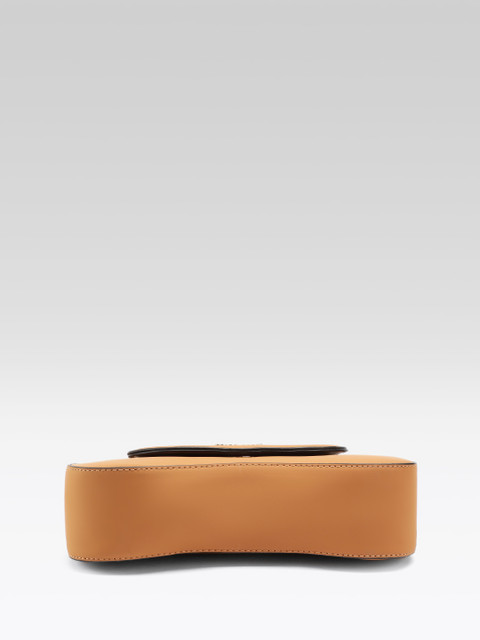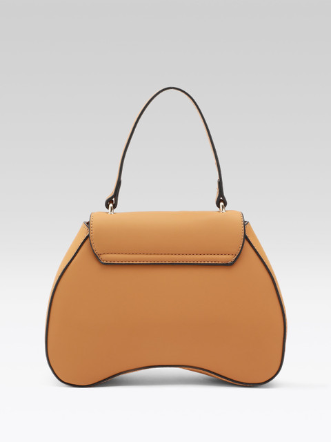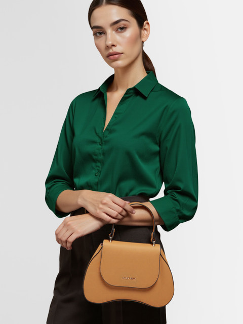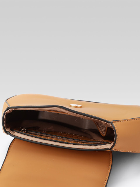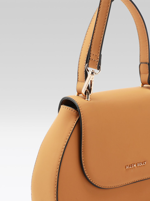 Brown solid satchel bag has 1 main compartment, has a button closure, 4 inner pockets