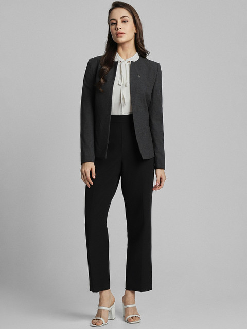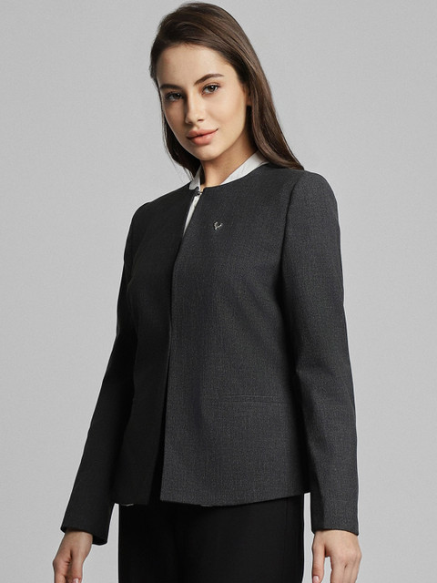Grey self-design slim-fit formal blazer, has a notched lapel, long sleeves, single-breasted button closure, two flap pockets, one welt pocket and a double-vented back hem