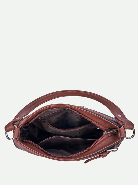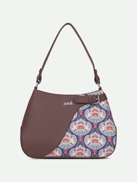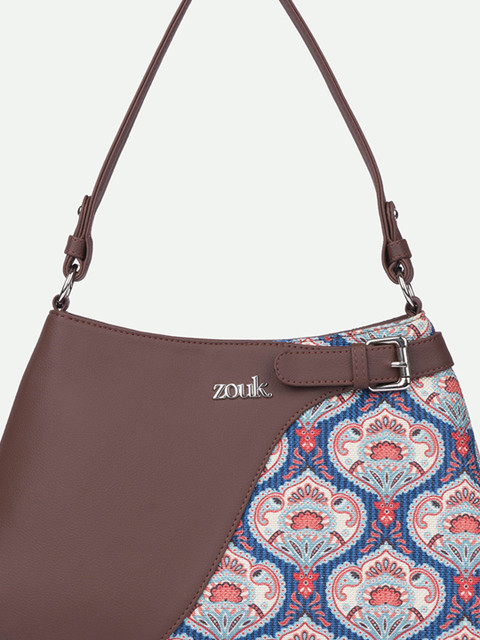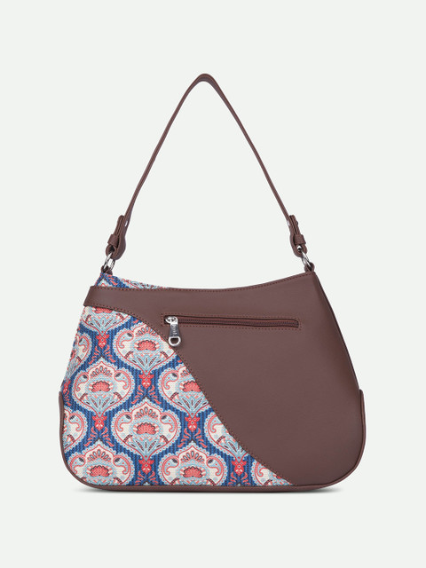 Blue & brown ethnic motifs printed handheld bag 1 main compartment, has a zip closure, 1 external pocket, 3 inner pockets