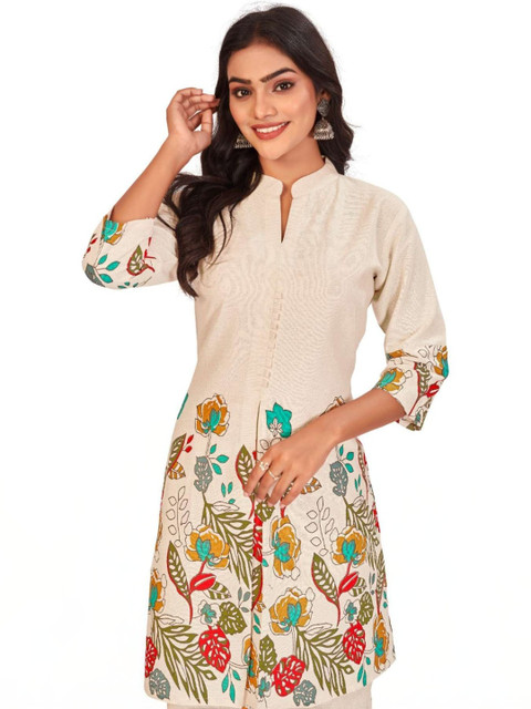 white & red printed tunic, has a mandarin collar neck and 3/4th sleeves