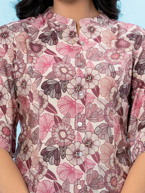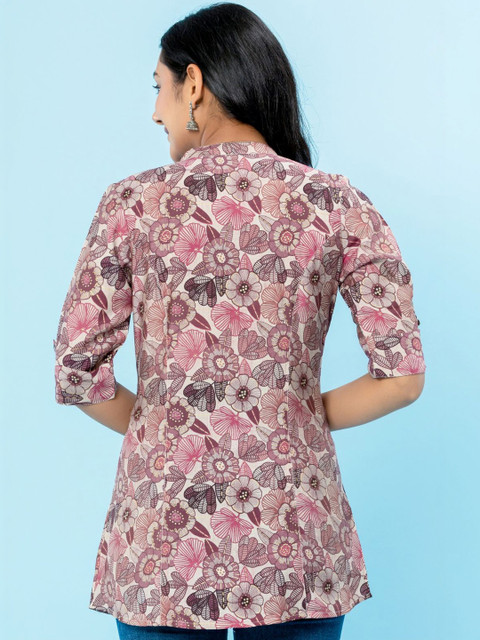 Add a refreshing Indo-Western vibe to your wardrobe with this A-line printed tunic. Designed with a mandarin collar and three-quarter sleeves, it offers a flattering fit and easy comfort for everyday wear.