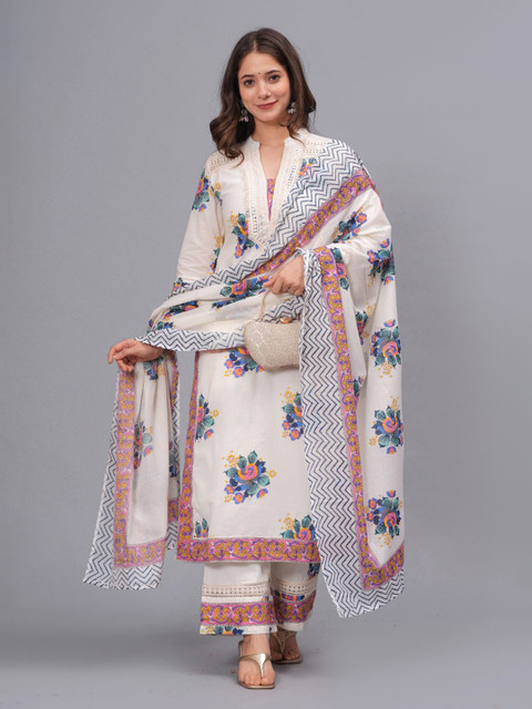 Pure Cotton Printed Straight Kurta Set with Palazzo Pants & Dupatta- Ethnic Wear, Blue