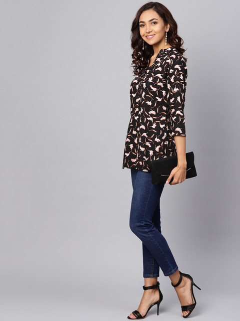 Black and off-white Bird print woven shirt style top, has a mandarin collar, three-quarter sleeves, button closure