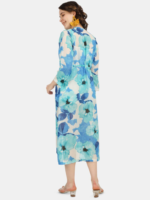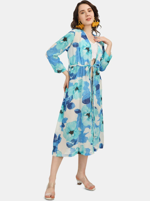 Blue and white printed tie-up longline shrug ,has long sleeves, straight hem