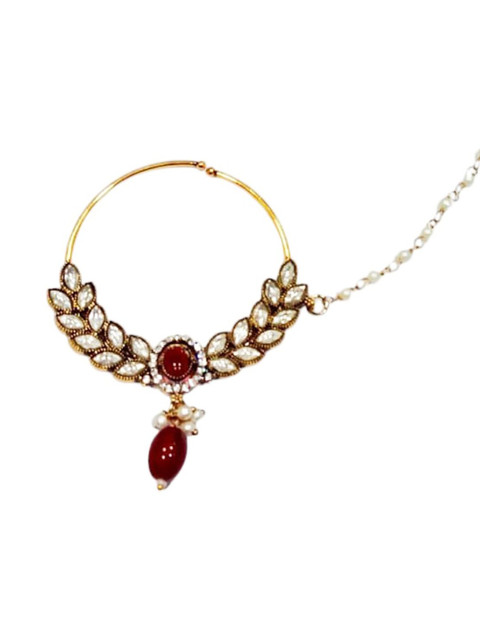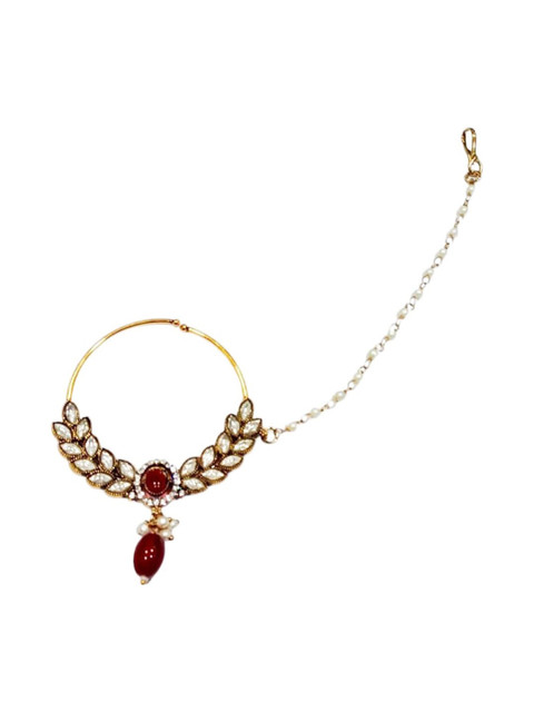 Gold-toned and white chained nosepin, has kundan studded and pearls beaded details