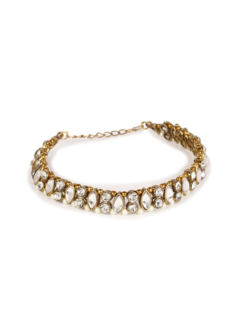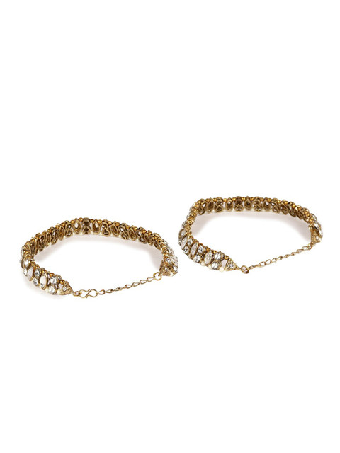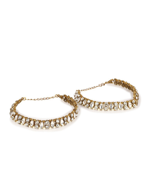 Gold-plated anklets, has white Kundan stone-studded and intricate textured details