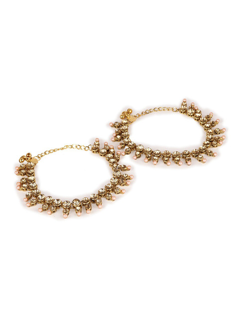 Set of 2 Gold-plated beaded anklets, has kundan stone-studded and intricate textured details