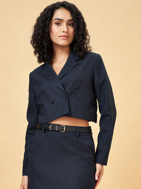 Navy blue striped regular-fit formal blazer, has a notched lapel, long sleeves, double-breasted with double button closure and a ventless back hem