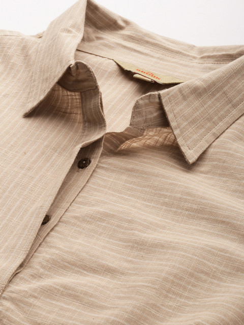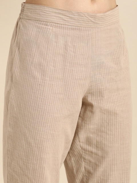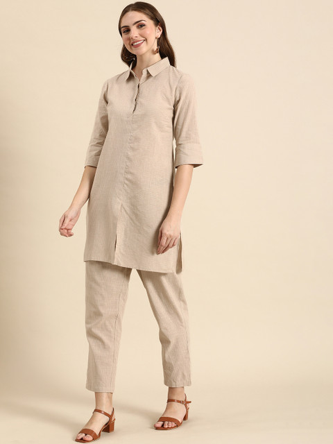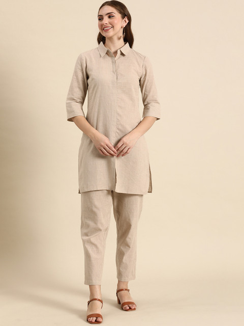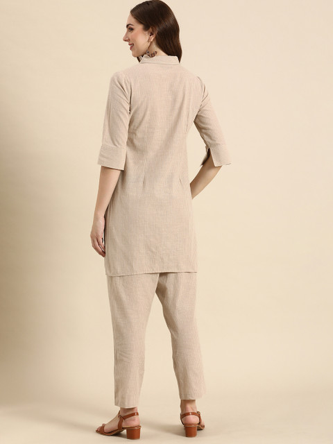 This co-ords consists of a tunic and trousers. Beige-coloured self-design tunic, has a shirt collar, and three-quarter sleeves. Beige-coloured self-design mid-rise trousers with slip-on closure.