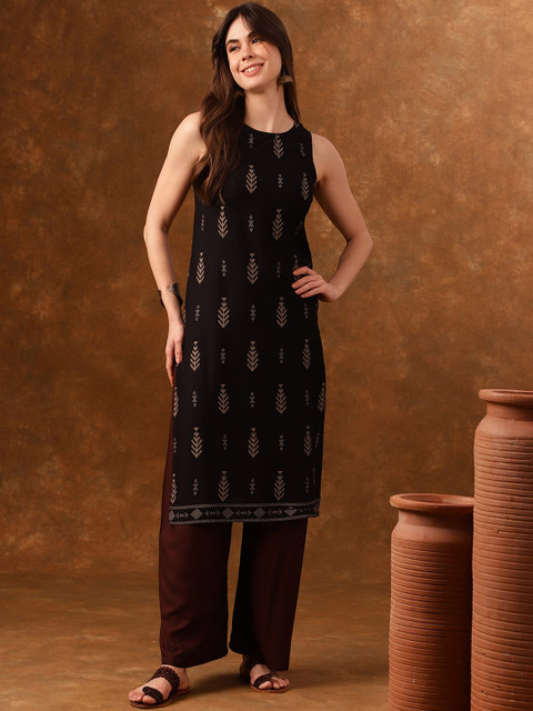 ⭐ Anouk Black Ethnic Motifs Printed Sleeveless Straight Kurta