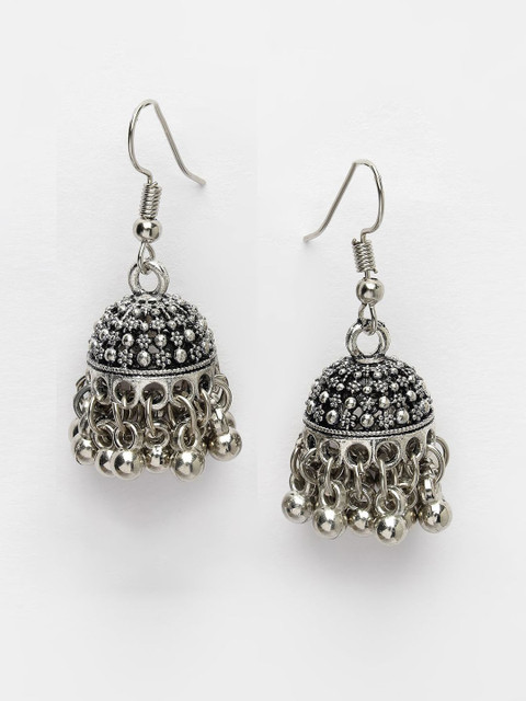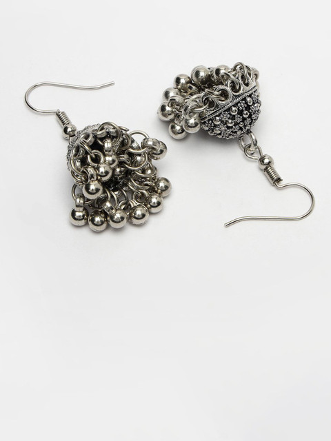 Silver-toned contemporary jhumkas, silver-plated, has artificial beads