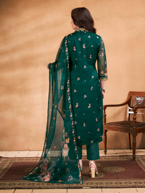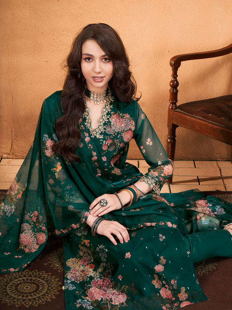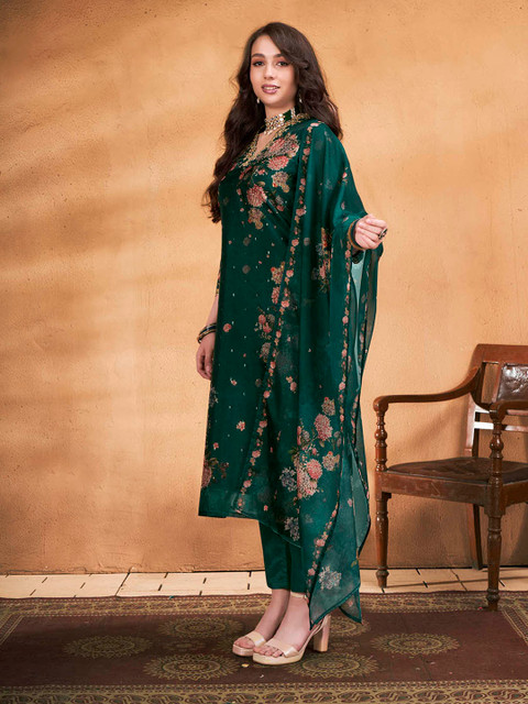 Anouk Dark Green Floral Printed Thread Work Straight Kurta with Trouser & Dupatta