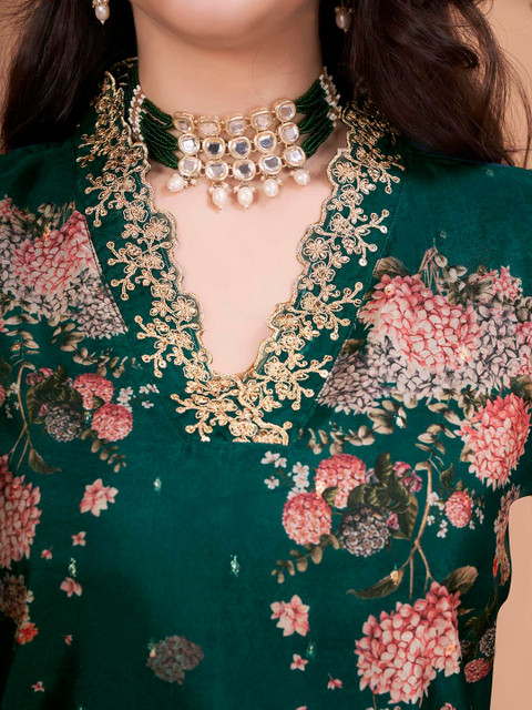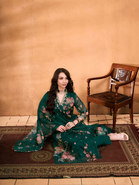 3 reviews for Anouk Dark Green Floral Printed Thread Work Straight Kurta with Trouser & Dupatta