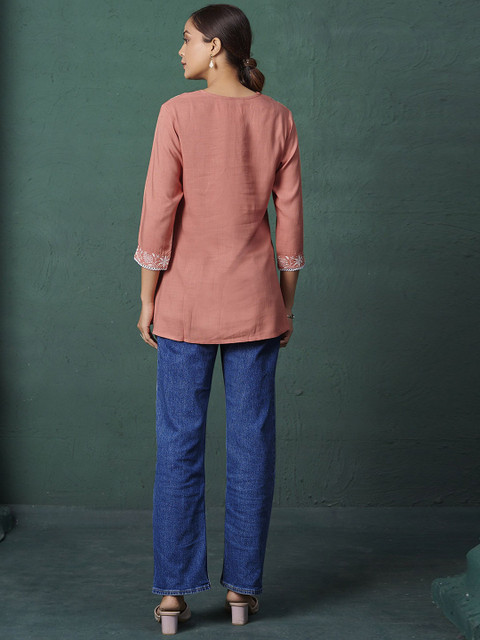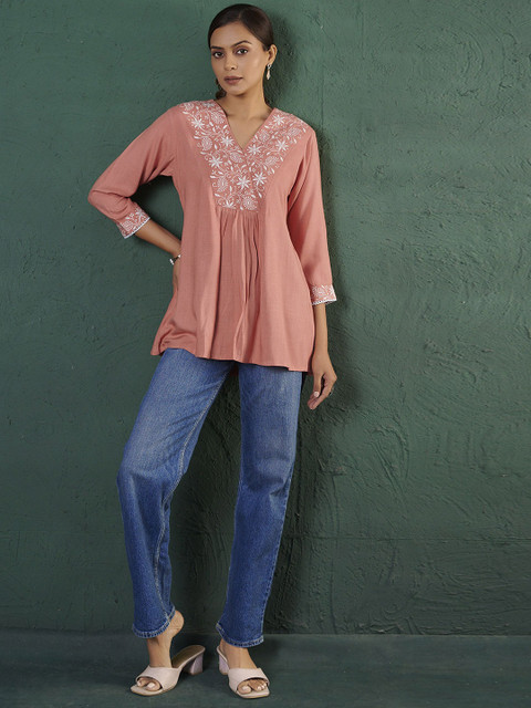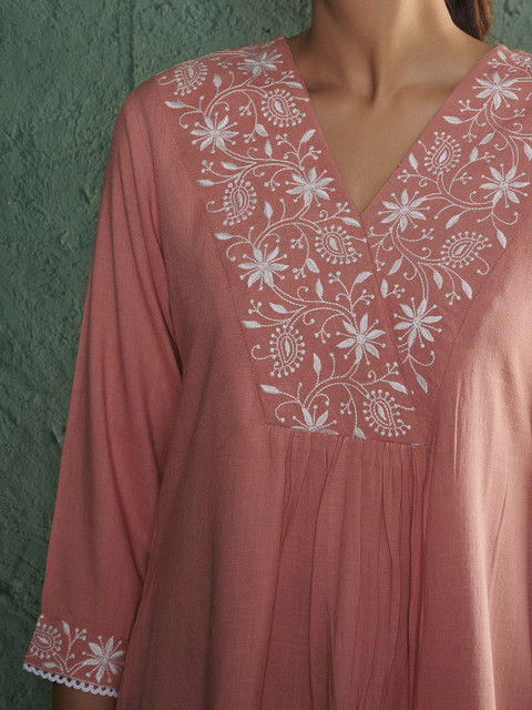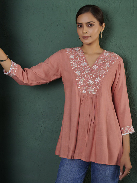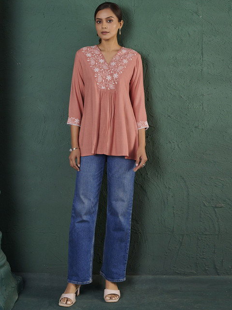 Elegant ethnic motif embroidery paired with a flattering V-neck.