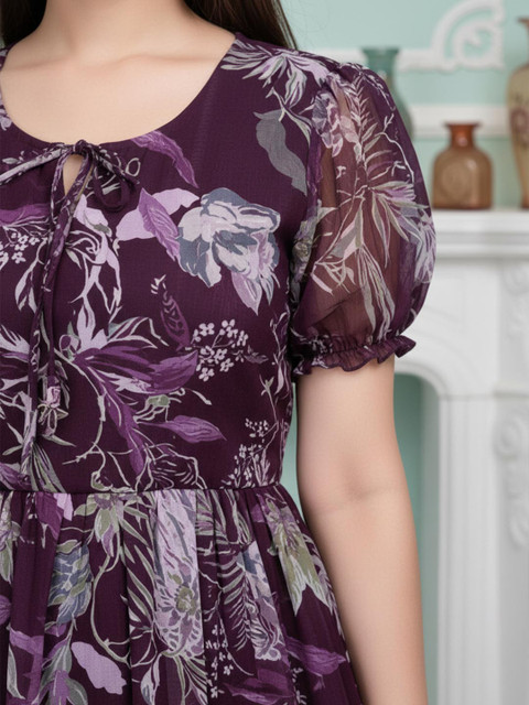 - Purple and purple floral print a-line dress