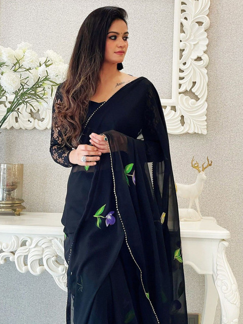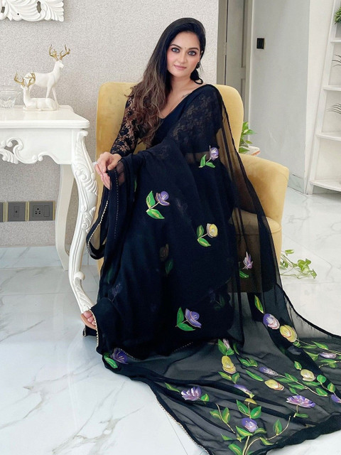- Floral printed saree with embellished border