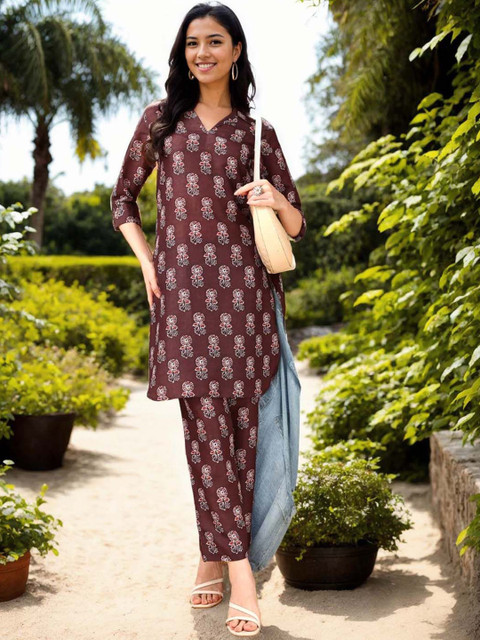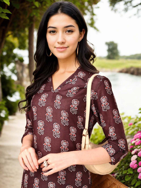 Coffee brown, red and white floral printed tunic, has a shirt collar neck and three quarter sleeves, secured with slip on closure