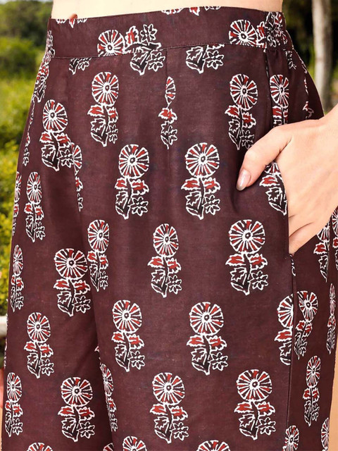 Coffee brown, red and white floral printed palazzos, has an elasticated waistband with slip-on closure has 2 pockets