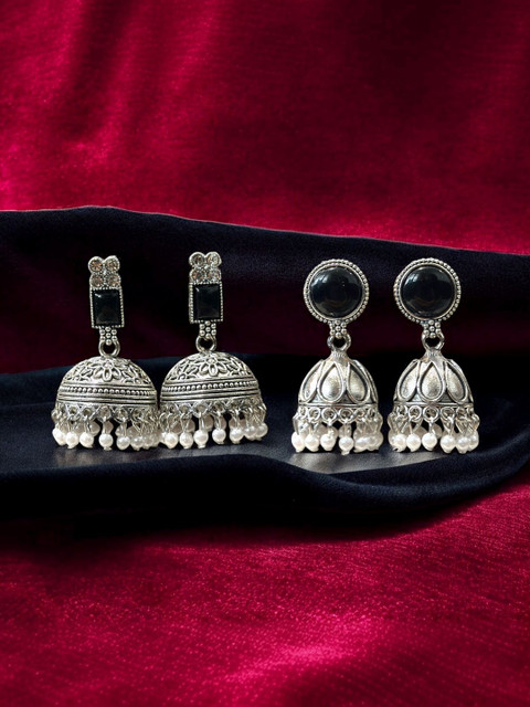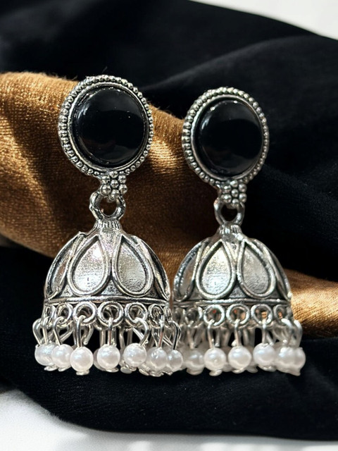 Silver-toned geometric jhumkas, silver-plated, has artificial beads