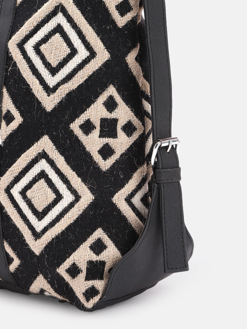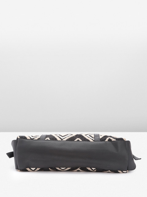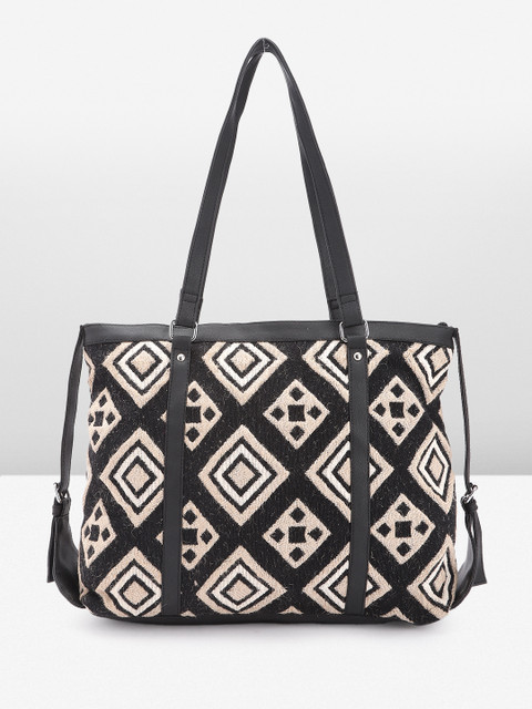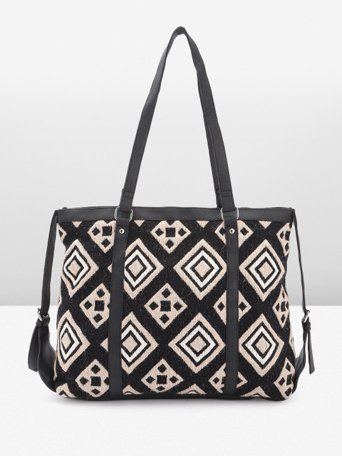 Black geometric printed tote bag, with embroidered detail