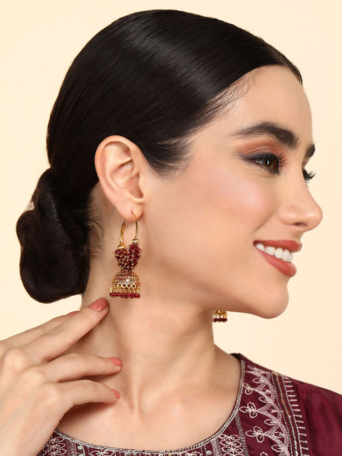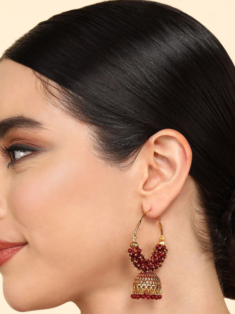 Maroon, dome shaped, jhumkas, gold-plated, has artificial beaded details