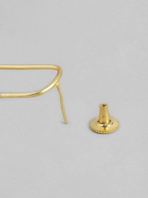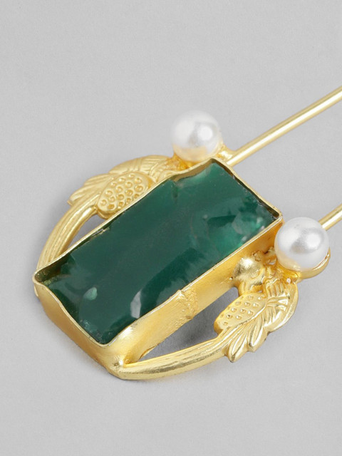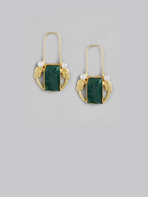 Gold-toned green square shaped drop earrings, gold-plated, has artificial stones studded & pearls beaded details