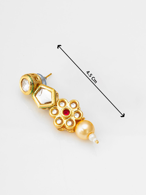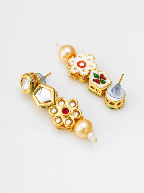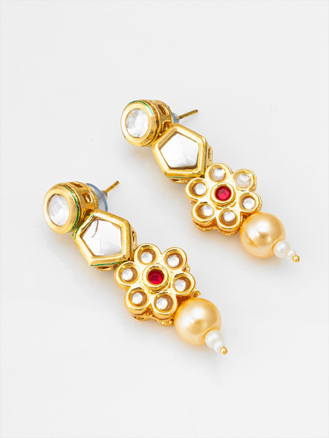 Gold-plated, pink and white geometric drop earrings, has artificial stones studded and beaded details