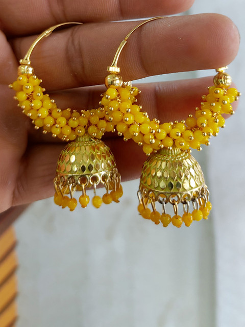Yellow and gold toned dome shaped jhumkas, gold-plated, has artificial beaded details