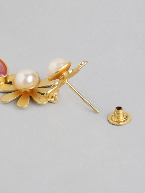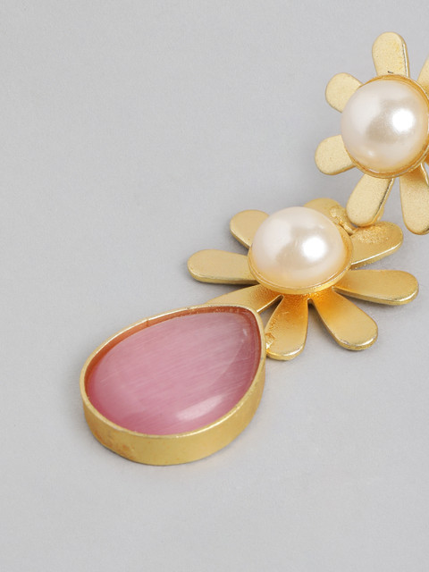Pink and gold-toned floral drop earrings, gold-plated, has artificial beads