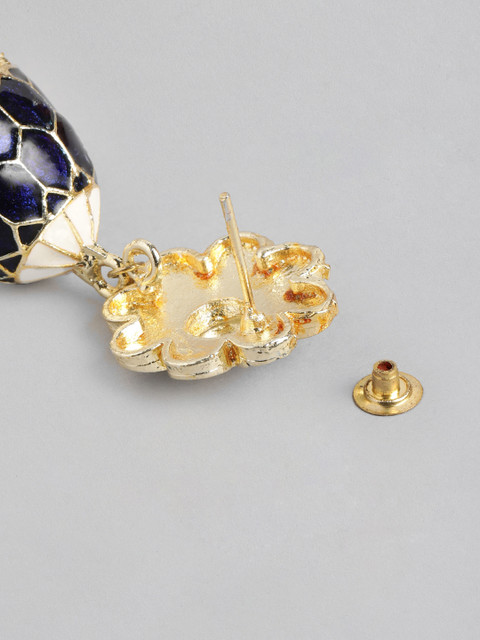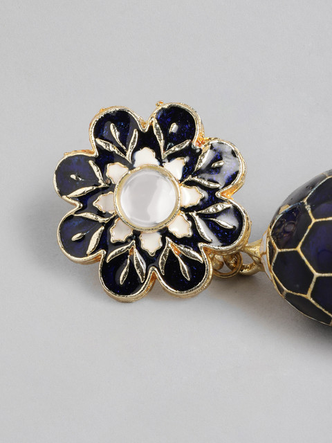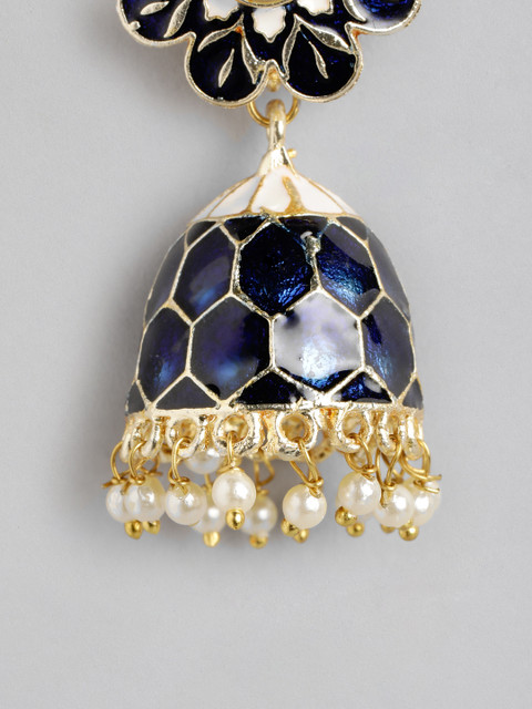 Blue and gold-toned dome shaped jhumkas, gold-plated, has artificial beads