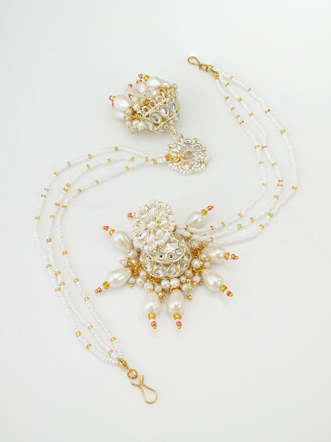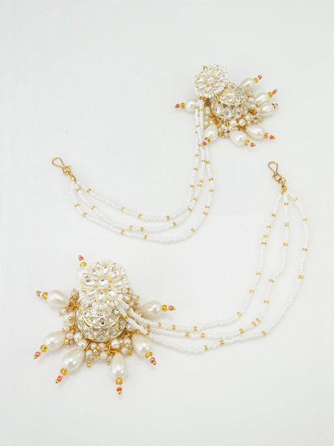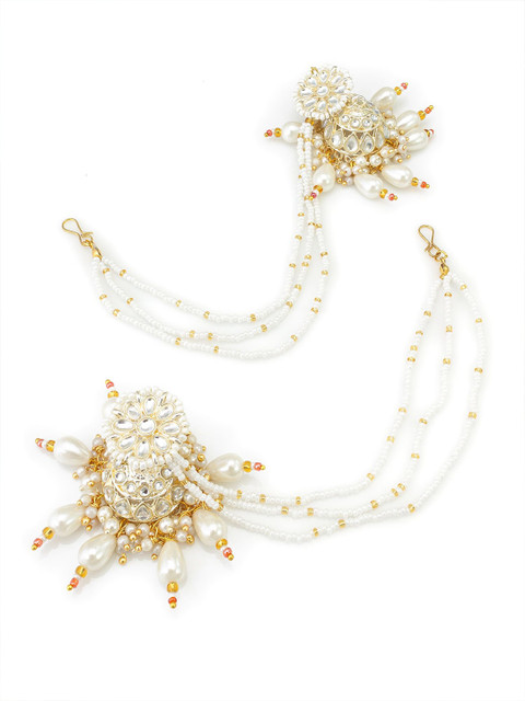 Gold-toned and white contemporary shaped jhumkas with earchain, has pearls beaded and artificial stones studded details