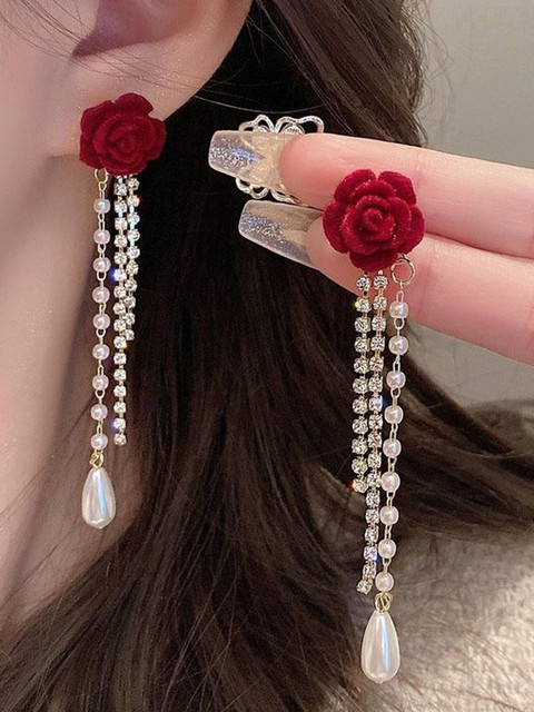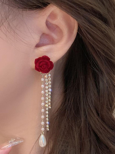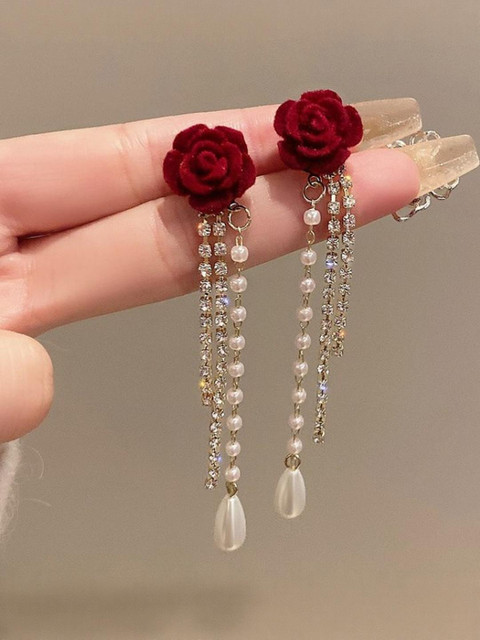 Gold-toned,red and white floral drop earrings, has pearls beaded details