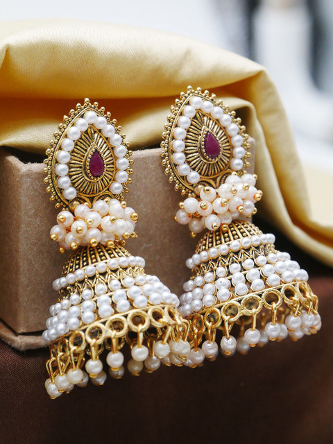 Gold-toned & white contemporary jhumkas, gold-plated, has pearls studded