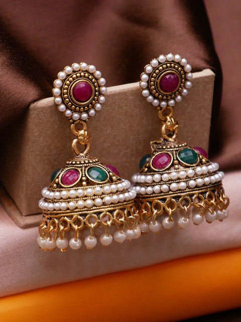 Gold-toned, white & red contemporary jhumkas, gold-plated, has artificial stones and beads studded