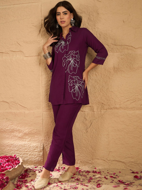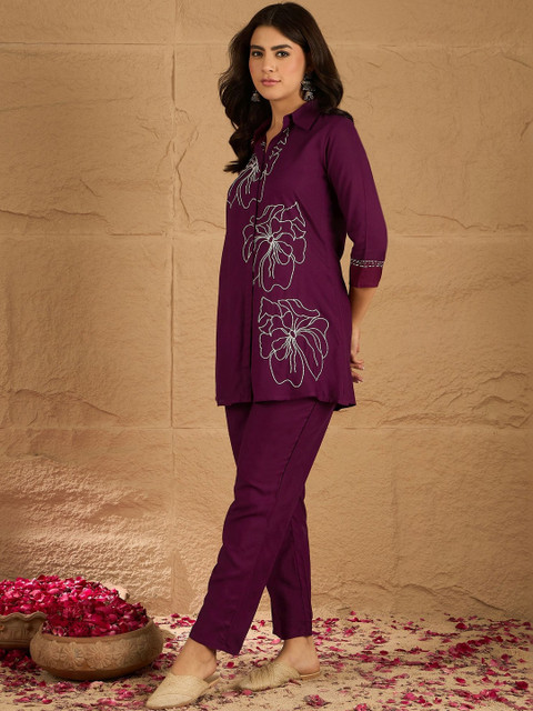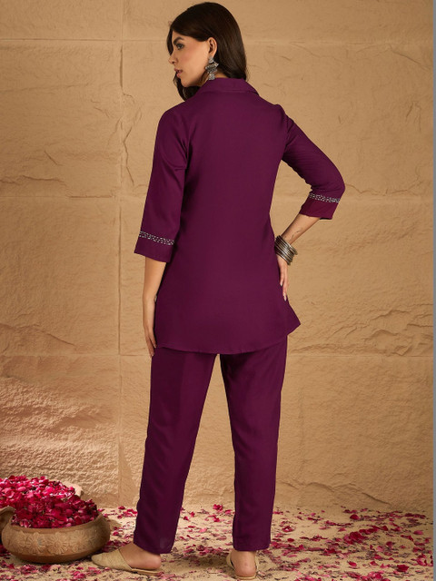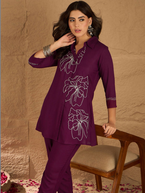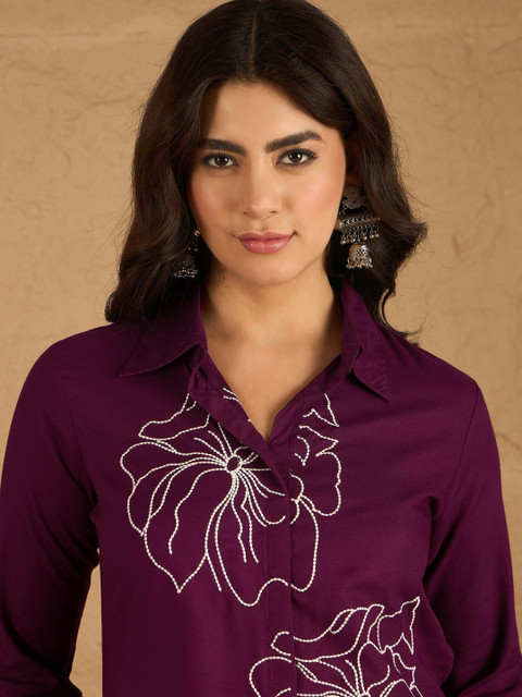 Burgundy and white embroidered top, has shirt collar, three quarter sleeves, full placket button closure and regular waist hem