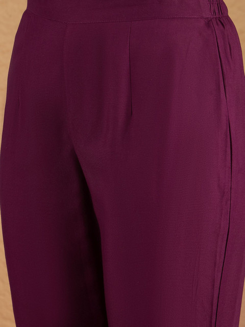 Burgundy solid mid-rise trousers, has elasticated waistband and slip-on closure