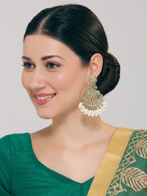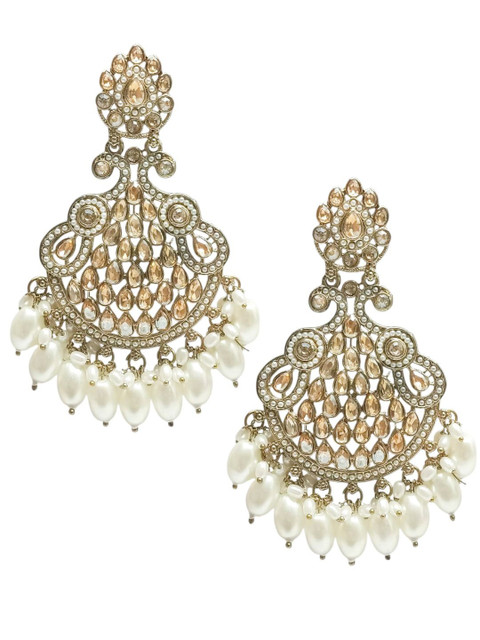 Gold-toned and white peacock shaped drop earrings, has kundan