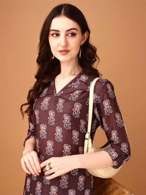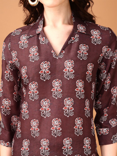 Maroon & white printed tunic, has shirt collar, three-quarter sleeves and curved hem