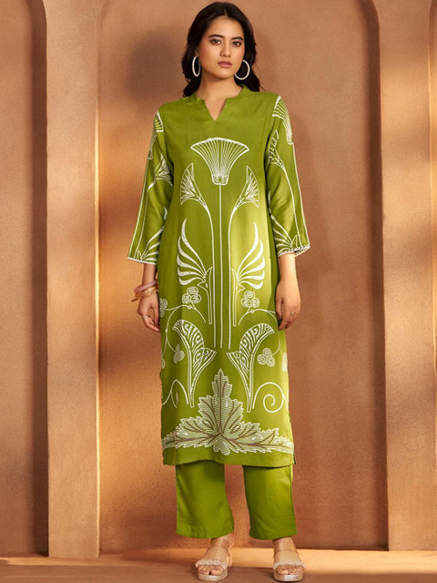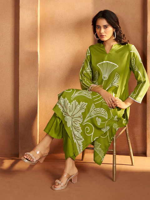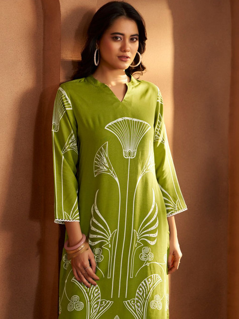 Green printed top has V-neck & three-quarter sleeves with slip-on closure