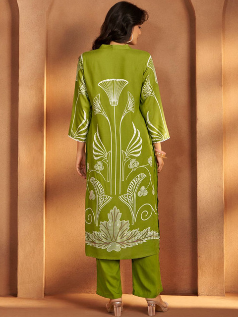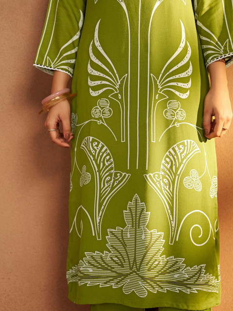 Green printred trousers has elasticated wasitband with slip-on clsoure